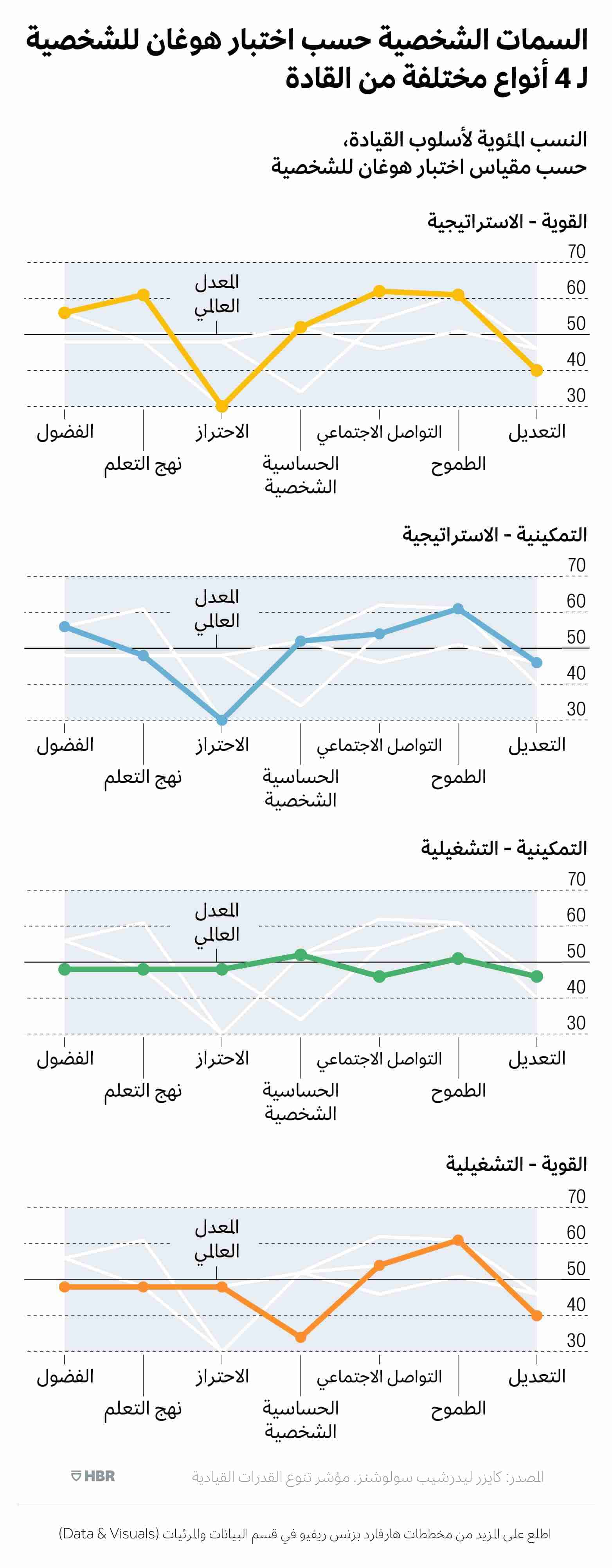 لنأخذ على سبيل المثال الملفات التعريفية الشخصية لـ 1,655 من كبار المدراء الذين يبدون أنماطاً مختلفة من السلوك القيادي، إذ تم تقييمها على مدار السنوات الـ 5 الماضية باستخدام اختبار هوغان للشخصية وفقاً لتقييم زملائهم في العمل لهم. من بين نوعي القادة الذين يبدون سلوك القيادة القوية، يبدي القادة الذين يركزون على السلوكيات التشغيلية على حساب السلوكيات الاستراتيجية درجة أعلى من الاحتراز، ولكن درجتهم كانت أقل في الفضول ونهج التعلم والتواصل الاجتماعي، وخاصة الحساسية الشخصية. يتسم من يبدون السلوكيات القوية التشغيلية بأنهم تقليديون وعمليون أكثر واجتماعيون بدرجة أقل وعنيدون، بينما يتحدى من يبدون السلوكيات القوية الاستراتيجية التقاليد وهم أكثر إبداعاً وذكاءً وانخراطاً اجتماعياً.