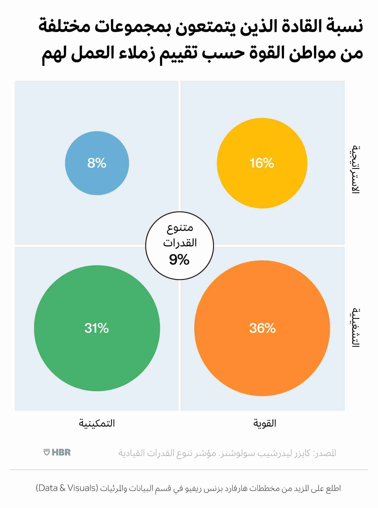 من المؤسف ألا نجد قائداً متنوع القدرات إلا نادراً، قيّمنا أكثر من 24 ألفاً من كبار المدراء عبر مجموعة متنوعة من القطاعات على مستوى العالم منذ عام 2013 باستخدام مؤشر القيادة المتنوعة القدرات المتعدد المصادر. استناداً إلى التقييمات الواردة من زملائهم في العمل حول سلوكهم، فإن أقل من 10% من هؤلاء القادة يبرع في الموازنة بين القيادة القوية والتمكينية والموازنة بين القيادة الاستراتيجية والتشغيلية. يميل معظم المسؤولين التنفيذيين إلى إجادة مجموعة واحدة من السلوكيات في كل زوج منها، وبالتالي يميلون إلى الإفراط في الاعتماد عليها على حساب السلوكيات التكميلية. ونتيجة لذلك، تصبح مواطن قوتهم نقاط ضعفهم، ما يخلق قصر نظر في رؤيتهم ويحد من تنوع قيادتهم.