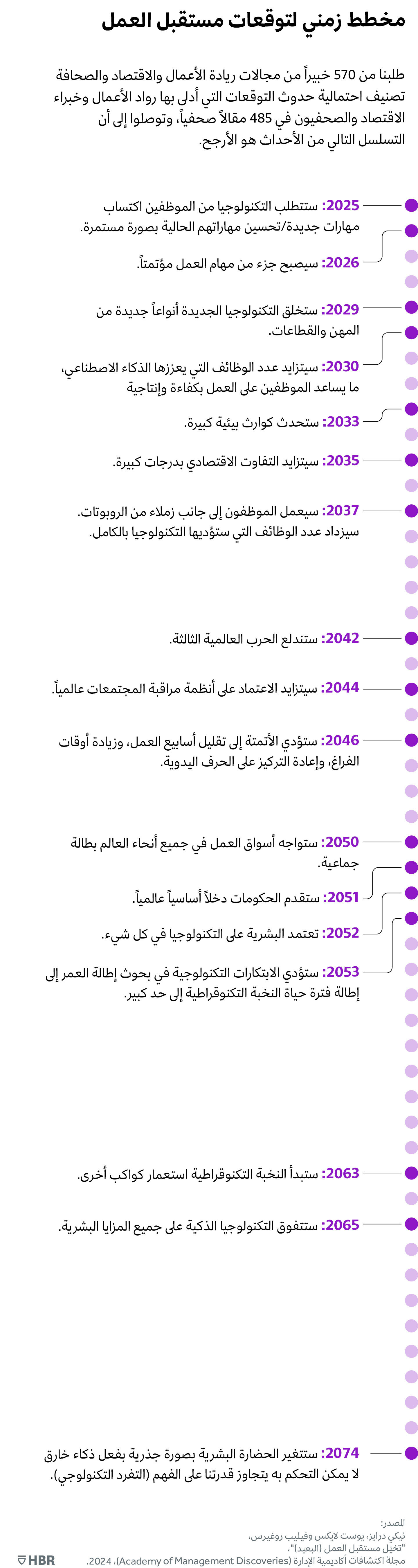 ثم طلبنا منهم تقدير السنة التي يتوقعون أن يتحقق فيها كل توقع ومدى ثقتهم بتحققه. كانت نتائج الاستقصاء مماثلة لتوقعاتنا، إذ توقع المتفائلون عموماً إنجازات غير مسبوقة في المستقبل القريب؛ في حين توقع المتشائمون نتائج سلبية وشيكة؛ وتوقع المتشككون أن العديد من التوقعات لن تحدث أبداً، أو أنها ستحدث في المستقبل البعيد فقط. وبافتراض أن آراء كل مجموعة من هذه المجموعات تحمل قدراً من الصحة، حسبنا متوسط توقعاتها ثم عمدنا إلى تمثيلها بيانياً على مخطط زمني للتوصل إلى هذه النظرة الجماعية المثيرة للقلق حول مستقبل العمل: