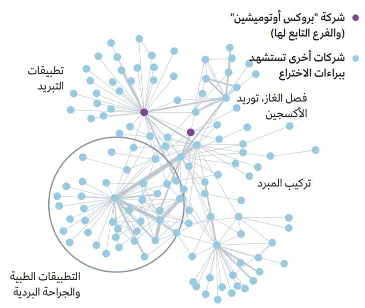 تمثل كل عقدة في خريطة الاستشهادات الواردة أدناه واحدة من الشركات التي تستشهد بإحدى التقنيات الأساسية الست لشركة "بروكس أوتوميشين" بشكل مباشر، أو بشكل غير مباشر من خلال الاستشهاد ببراءات الاختراع التي تستشهد ببراءات اختراع "بروكس". وتقع الشركات في 5 مجالات تطبيقية مختلفة. ويربط كل سطر شركة بشركة أخرى تستشهد ببراءات اختراعها بشكل مباشر، وتشير كثافة الخطوط إلى عدد الاستشهادات. وتمثل العُقد في المجموعة المحاطة بدائرة شركات التطبيقات الطبية.