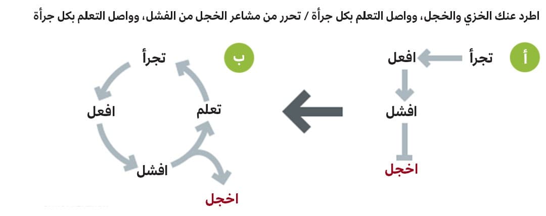 إذا سمحت للفشل أن يحدد مصيرك، فستقع فريسة إحساس بالعار يغرقك ويغرق أحلامك. تقول خبيرة الأبحاث الرائدة حول الشعور بالخزي والضعف الإنساني، الدكتورة برينيه براون، إن هذا الموقف ينطبق تماماً على الذين يحترفون الرياضة والعسكريين والموظفين وقادة الشركات، وذكرت في كتابها "الجرأة باقتدار" (Daring Greatly) "في بيئة تسودها عقلية 'إن لم تكن ذئباً أكلتك الذئاب' يكون الفشل مرادفاً للقتل"، وستشعر بعار كبير إن رآك الآخرون ضعيفاً. خذ مثلاً الخطاب الذي أخفقتُ فيه؛ عندما انتهيت، شعرت كأنني ركضت للتو ثلاثة أميال، فقد كنت أتصبب عرقاً. والشركة التي تراكمت عليها الديون؛ ألم يكن عليّ بذل جهد لفهم الموقف بوضوح أكبر؟ كيف لي أن أدعي أنني مستثمرة حصيفة؟ علينا أن نتخلص من إحساس العار الذي نشعر به عندما نفشل، وألا نعطيه حجماً أكبر مما يستحق، وإلا فلن نتحدث أمام الجمهور مرة أخرى أو ننتقل إلى وظيفة أخرى أو نستثمر في شركة أخرى. لن يتعثر الحلم والابتكار بسبب الفشل، بل بسبب العار، وبإخراج العار من المعادلة سنتخلص من تباطؤ الابتكار ونحصل على الزخم الذي نحتاج إليه حتى نستعيد روح الجرأة والمبادرة.
