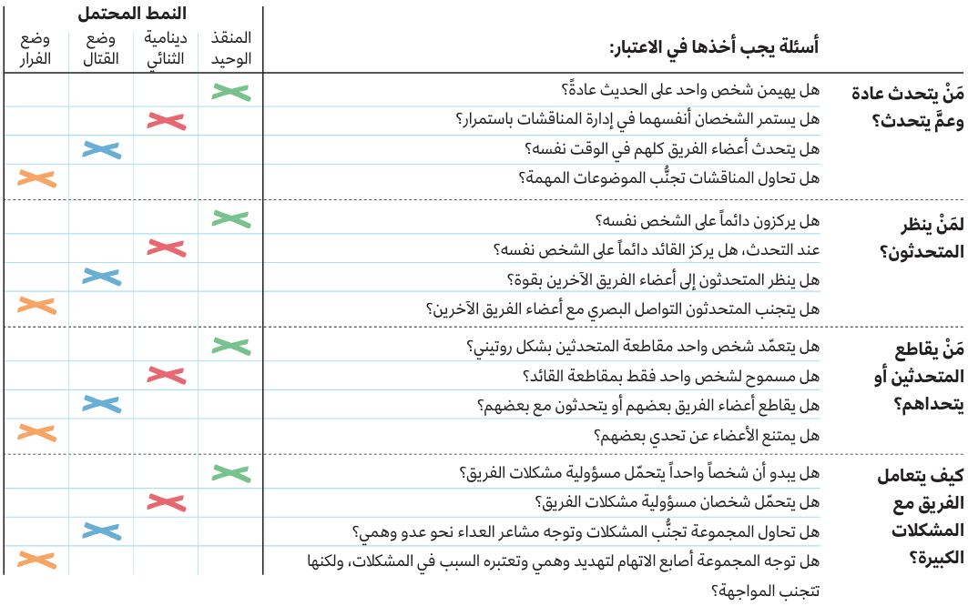 عندما يعلق أعضاء الفريق في أحد الأنماط الأربعة، فإنهم يفقدون قدراتهم الجماعية والفردية. قد يبدون منغمسين في مهمة حيوية ولكنها غامضة، ويناقشون الأمور الجانبية كما لو كانت ذات أهمية كبيرة، دون أي بادرة تسامح مع محاولات الاحتواء. ولن تستعيد المجموعة السيطرة الكاملة على قدراتها إلا عندما تدرك أن مصدر قلقها يكمن داخل الفريق وليس خارجه.