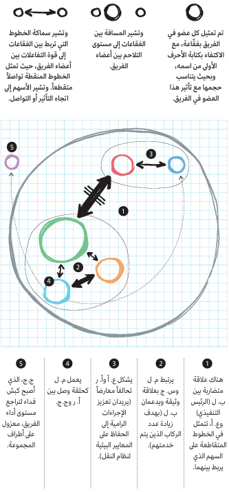 أعدَّ الرسم التالي أحد أعضاء هيئة النقل بإحدى المدن الأوروبية التي كانت تجد صعوبة في التوافق حول استراتيجية محددة، ورصد من خلاله العلاقات والتوترات داخل فريق الإدارة العليا بالمؤسسة.