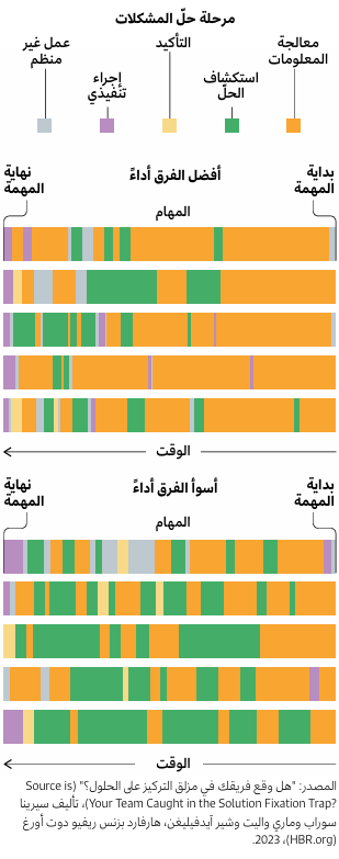 تخصّص الفرق الناجحة وقتاً أطول بكثير من غيرها لجمع المعلومات وتحليلها قبل العمل على التوصُّل إلى الحلول. ونستعرض فيما يلي وصفاً لكيفية تعامل أفضل 5 فرق وأسوئها من ناحية الأداء ضمن مجموعة مكوَّنة من 28 فريقاً مع تجربة محاكاة التعلم (إفصاح: برنامج المحاكاة، إيفريست في 2 (Everest V2)، هو أحد منتجات هارفارد بزنس ببليشينغ).