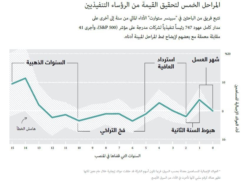 نادراً ما يتشابه عهدا رئيسين تنفيذيين. فكل قائد له مسيرته الخاصة به، ويواجه ظروفاً محددة تماماً. ومع ذلك، عندما قارنّا أداء الرؤساء التنفيذيين على أساس السنوات التي قضوها في مناصبهم وليس على أساس السنوات التقويمية، وعندما نظرناً إلى مسيرة مركّبة مؤلفة من مسيرات عدة أفراد توصّلنا إلى تحديد خمسة مراحل مميزة لعملية تحقيق القيمة سيمر بها العديد من الرؤساء التنفيذيين خلال عهودهم في مناصبهم.