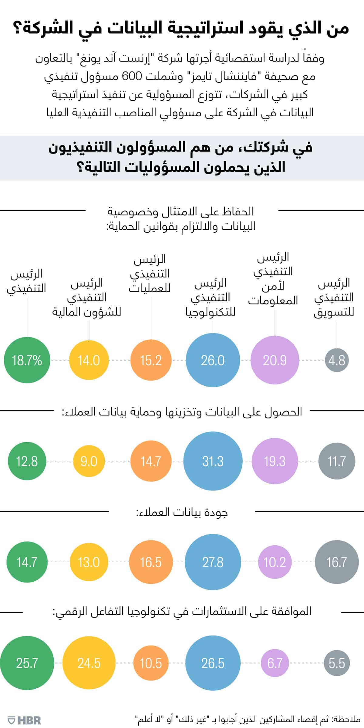 لن يكون إحداث تغيير دائم ذي قيمة ممكناً إلا عن طريق شراكة حقيقية بين قادة الأعمال في أقسام المبيعات والتسويق والتكنولوجيا والبيانات والتحليلات والشؤون المالية، في الحقيقة، أخذت الدراسة الاستقصائية التي أجرتها شركة "إرنست آند يونغ" مع صحيفة "فايننشال تايمز" آراء 600 مسؤول تنفيذي كبير متعدد الوظائف في أقسام التسويق والتكنولوجيا والشؤون المالية، وأكدوا أن استراتيجية البيانات باتت موزعة أكثر من أي وقت مضى على أدوار المسؤولين التنفيذيين ومنها الرئيس التنفيذي والرئيس التنفيذي للشؤون المالية ورئيس العمليات والرئيس التنفيذي للتكنولوجيا والرئيس التنفيذي لأمن المعلومات والرئيس التنفيذي للتسويق.