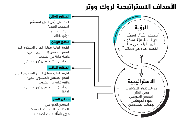 وضع تشامبرز، بالتعاون مع فريق الإدارة العليا لديه، رؤية هذا نصّها: "بوصفنا المُورِّد المفضّل لدى زبائننا، فإننا سنكون الجهة الرائدة في هذا القطاع في توفير أرفع معايير الأمان والجودة لهم"؛ كما عمد إلى وضع استراتيجية لتنفيذ هذه الرؤية. وقد تشكّلت الاستراتيجية من العناصر الخمسة التالية: خدمات تفوق توقعات الزبائن واحتياجاتهم؛ ومستويات رفيعة من رضى الزبائن؛ وتحسين متواصل في درجة الأمان، وموثوقية في المعدّات، وسرعة في التجاوب، وفعالية في التكلفة؛ ومستوى رفيع من الموظفين؛ وتلبية لتوقعات المساهمين. وقد طوّروا هذه العناصر بدورها إلى أهداف استراتيجية (راجعوا الشكل الإيضاحي: "الأهداف الاستراتيجية لروك ووتر"). غير أن الأهداف الاستراتيجية كانت بحاجة إلى ترجمة إلى أهداف كمية وإجراءات ملموسة لكي تحقق القيمة للشركة.