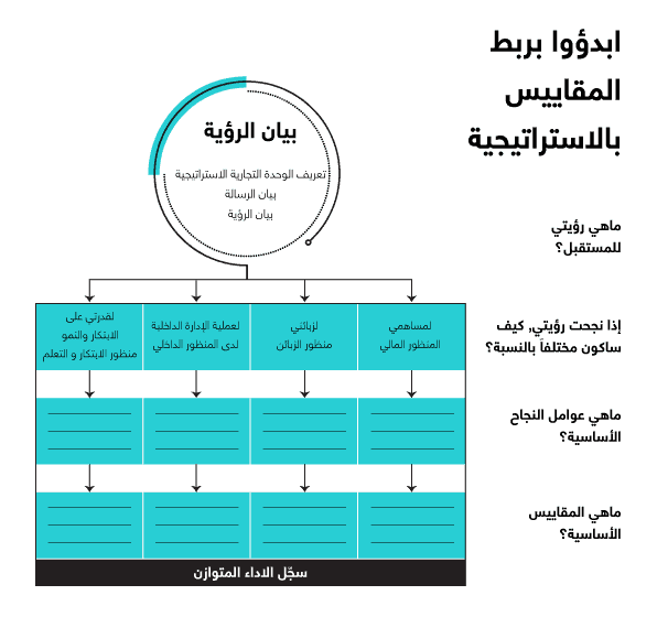 يُعتبر ربط القياسات بالاستراتيجية هو جوهر النجاح في عملية وضع سجلّ الأداء المتوازن. وثمّة ثلاثة أسئلة رئيسية ينبغي طرحها: