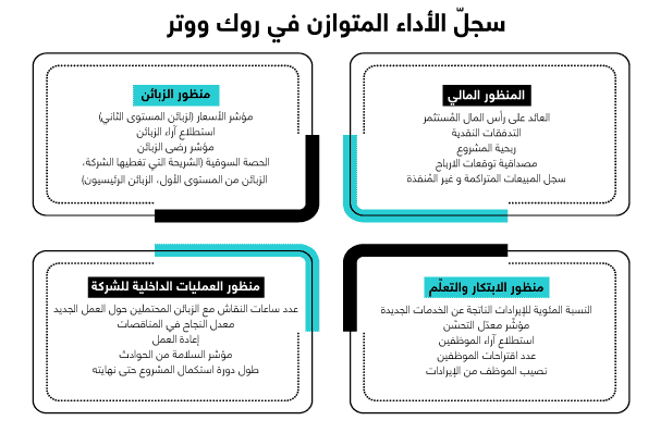 كما قام فريق الإدارة العليا في روك ووتر بتحويل رؤيته واستراتيجيته إلى سجلّ أداء متوازن يضمّ أربع مجموعات من مقاييس الأداء (راجعوا الشكل الإيضاحي: "سجلّ الأداء المتوازن في روك ووتر").