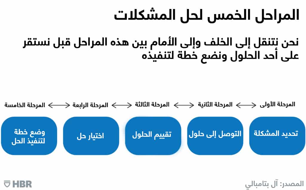 ولفهم طبيعة الحل البديهي للمشكلات، يتعين علينا أولاً إدراك أنه عندما نعمل على حل أي مشكلة، ابتداء من اختيار ربطة عنق ووصولاً إلى حل المعادلة التربيعية، فإننا نشق طريقنا عبر خمس مراحل، تتمثل فيما يلي: