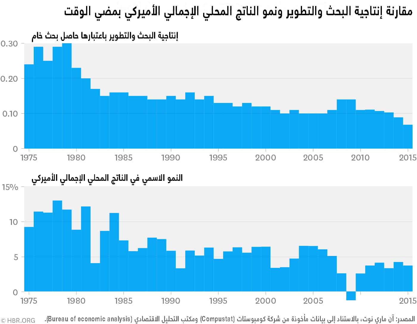 بغض النظر عن أهمية الابتكار بالنسبة للشركات فضلاً عن الاقتصاد الأوسع نطاقاً، وعلى الرغم من زيادة عدد العلماء والمهندسين المشاركين في البحث والتطوير بنسبة 250% وأن جميع الخبراء مكرسون لمساعدة الشركات على الابتكار، إلا أن المال الذي تُنفقه الشركات على البحث والتطوير يُولّد نتائج متناقصة أكثر فأكثر. في الواقع، يُبين البحث الذي أجريته تراجع العائدات على إنفاق الشركات على البحث والتطوير بنسبة 65% خلال العقود الثلاثة الماضية.