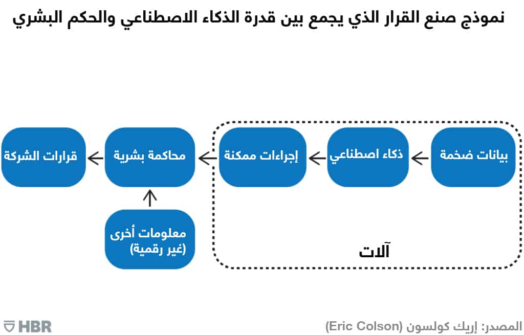 الأهم من ذلك كله هو أنّ البشر لا يتفاعلون مباشرة مع البيانات، لكنهم يتفاعلون مع الاحتمالات الناتجة عن معالجة الذكاء الاصطناعي للبيانات. تُعتبر القيم والاستراتيجية وثقافة الشركة بوصلتنا للتوفيق بين قراراتنا والمنطق الموضوعي، ومن الأفضل أداء ذلك بوضوح وبطريقة مدروسة. من خلال تسخير إمكانات كل من الذكاء الاصطناعي والبشر، يمكننا اتخاذ قرارات أفضل من تلك المأخوذة بالاستناد إلى أحدهما فقط.