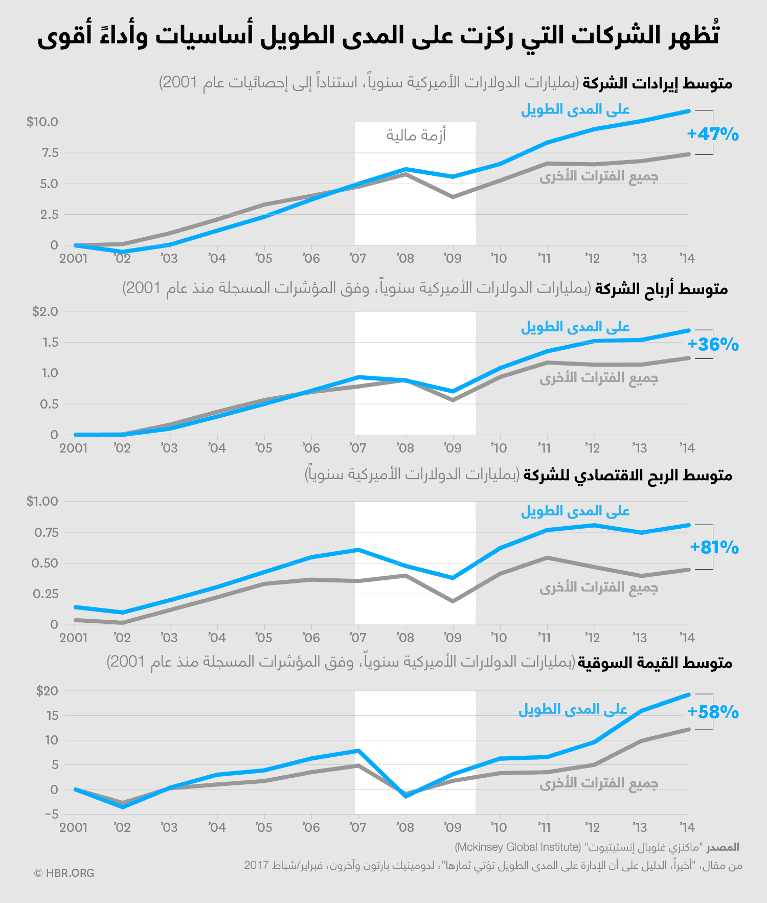 تُظهر البحوث أن الشركات التي تفكّر بعقلية التركيز على المدى الطويل، بدلاً من التركيز على الضغط الذي يفرضه محللو البيانات والمستثمرون لتلبية توقعات أرباح "وول ستريت" ربع السنوية، تفوقت باستمرار على نظيراتها في القطاع منذ عام 2001 فيما يخص كل إجراء مالي مهم تقريباً.