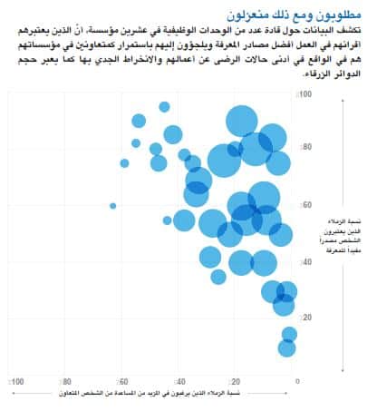ويوضح الرسم البياني "مطلوبون ومع ذلك منعزلون" المشكلة من خلال بيانات قادة عدد من الوحدات الوظيفية في عينة من عشرين مؤسسة. ويظهر الأفراد في أعلى الوسط وإلى اليمين – الذين يعتبرون أفضل مصادر المعرفة ويتم اللجوء إليهم باستمرار بصفتهم متعاونين في مؤسساتهم – في أدنى حالات الرضى عن أعمالهم والانخراط الجدي بها كما يعبر حجم الدوائر الزرقاء. وتظهر دراساتنا أن النتيجة الحتمية لذلك هو ترك الموظفين المتعاونين لمؤسساتهم (آخذين معهم معرفتهم ومواردهم الاجتماعية القيّمة) أو بقائهم فيها ونقل فتور حماسهم ولامبالاتهم المتزايدة إلى زملائهم.