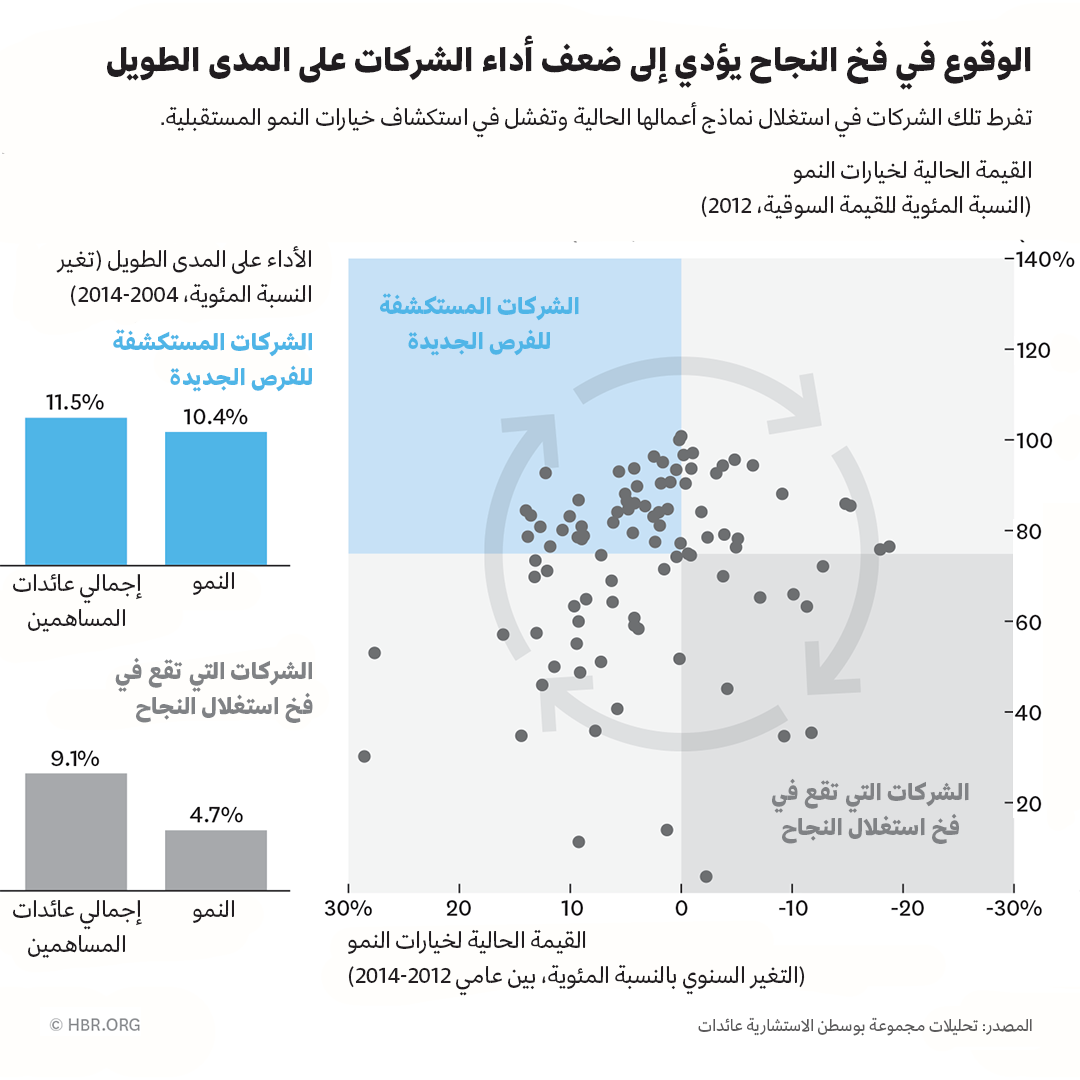 هذه الشركات نادرة للأسف؛ إذ تتبع غالبية الشركات مساراً يقودها نحو تقليل الاستكشاف ويعرّضها لخطر الوقوع في فخ النجاح. لماذا تقع الشركات الكبيرة التي تملك تاريخاً حافلاً بالنجاحات في هذا الفخ؟ تكمن المفارقة في أن اتباع هذا النهج يبدو في كثير من الأحيان الخيار الصحيح، فتحسين النماذج القائمة والناجحة يوفر مكاسب فورية أعلى بمخاطر أقل. يرتكب ثلث الشركات هذا الخطأ كل 5 سنوات، وينجم عنه انخفاضاً في النمو يعرّض مستقبل الشركة للخطر. وبعد مرور بضع سنوات، يؤدي انخفاض النمو إلى انخفاض عدد التفاعلات مع مجموعات العملاء الجدد ذات المتطلبات المختلفة، وبالتالي ينخفض الحافز للابتكار؛ وفي نهاية المطاف تصبح الشركة غير قادرة على تلبية متطلبات السوق المتغيرة. في تلك المرحلة، غالباً يكون تصحيح المسار صعباً للغاية. بمجرد وقوع الشركة في هذا الفخ، يصعب عليها الخروج منه؛ إذ تفشل نسبة 70% من الشركات في تجاوزه والعودة إلى مسار الاستكشاف والنمو في غضون 5 سنوات.