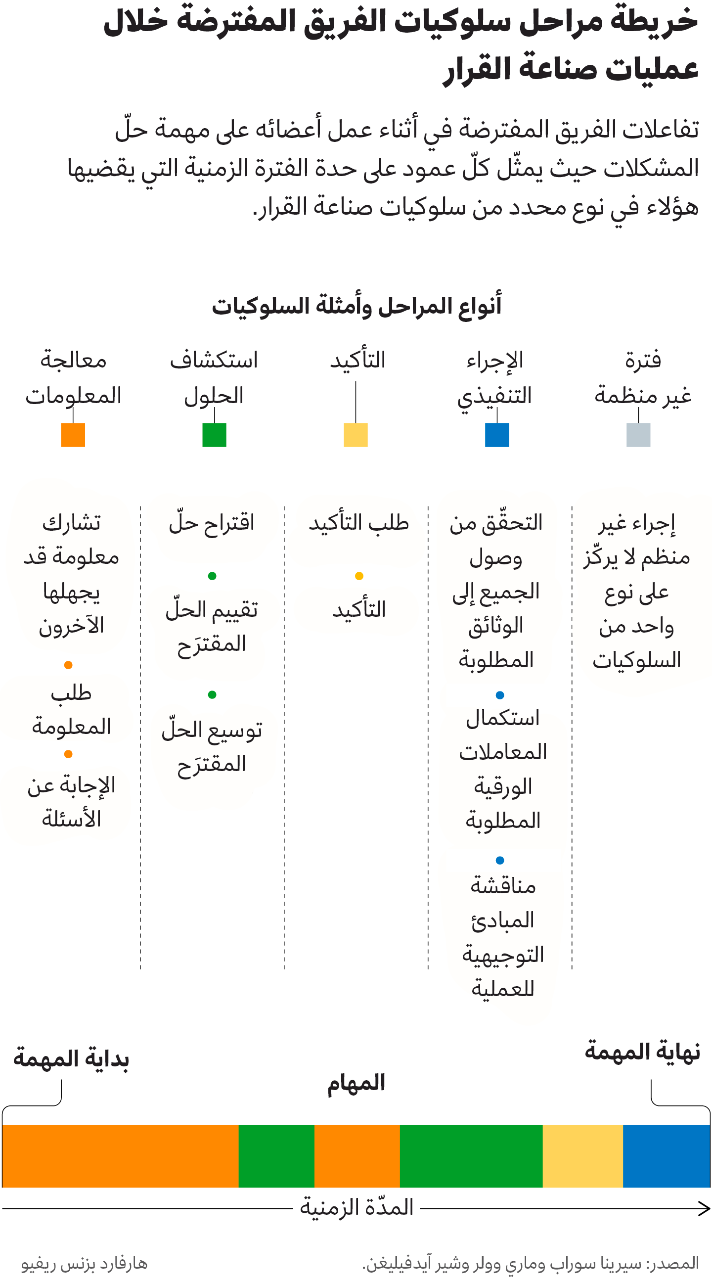 أظهرت الأبحاث السابقة لعلماء مثل مارشال بول وجونيل روث وروبرت بيلز أن سلوكيات الفرق المكلّفة بحل مشكلة ما يمكن تقسيمها إلى 4 أنواع من المراحل: 1) معالجة المعلومات و2) استكشاف الحلول و3) التأكد و4) الإجراء التنفيذي. تُظهِر الصورة التالية أمثلةَ السلوكيات التي تشكِّل كلّ مرحلة من هذه المراحل على حدة. عندما يعمل الفريق على مهمة معينة فإنه ينتقل بمرور الوقت من مرحلة إلى أخرى.