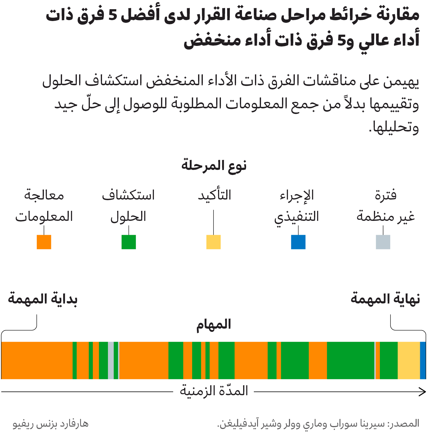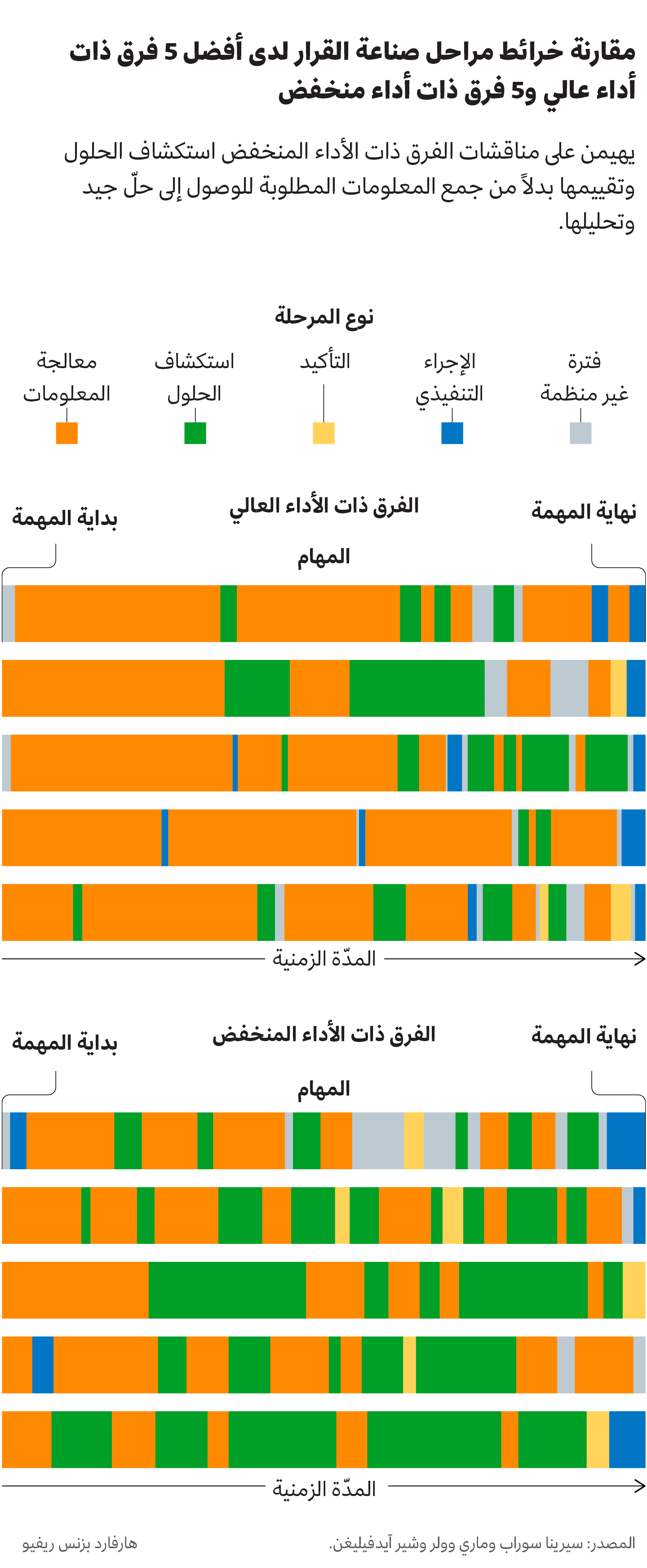 لاحظنا أيضاً أن تركيز هذه الفرق ذات الأداء المنخفض على استكشاف الحلول، يقلّل احتمالات بحثها عن المعلومات التي تجيب عن الأسئلة المطروحة؛ إذا سأل أحد أعضاء الفريق مثلاً: "ماذا نعرف عن المشكلة س؟"، فالفرق ذات الأداء المنخفض تتجاهل السؤال وتستمر في مناقشة الحلول المحتملة دون إثباتها. ويحدّ هذا التمسك بمناقشة الحلول من قدرة الفرق ذات الأداء المنخفض على كشف المعلومات المتاحة وتقييمها بالكامل، ما يؤدي في نهاية المطاف إلى اتخاذ قرارات سيئة. ومن المثير للاهتمام أن هذه الفرق التي يبدو أنها تسارع إلى مناقشة الحلول لا تنجز المهمة في مدة أسرع من الفرق ذات الأداء العالي.