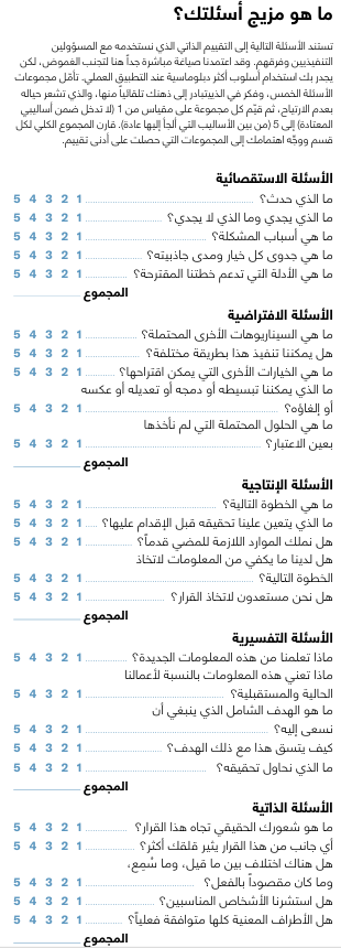 نوِّع مجموعة الأسئلة التي تطرحها؛ بعد أن تحدد أنماط الأسئلة التي ترتاح لطرحها وتلك التي تجد صعوبة في طرحها، عليك أن تسعى إلى الموازنة فيما بينها على نحو أفضل. يمكنك البدء بتذكير نفسك بالفئات الخمس قبل كل اجتماع خاص بصناعة القرار والتأكد من مراعاتها جميعاً. وقد طلب الرئيس التنفيذي لشؤون الموارد البشرية في إحدى كبرى شركات التكنولوجيا التي عملنا معها أن نعرض الإطار النظري طوال فترة تنفيذ برنامج مهم في الشركة.