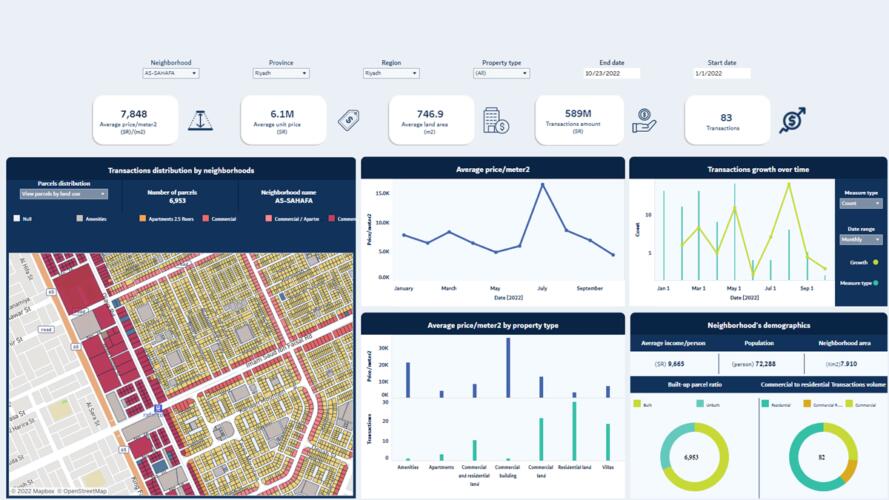 ولحسن الحظ، استطاعت بعض المنصات، عبر خوارزميات الذكاء الاصطناعي، استغلال تدفق هذه البيانات في الوقت الفعلي لتقديم تحليلات وتنبؤات في منتهى الدقة تمكّن الأطراف الفاعلة في قطاع العقارات من اقتناص الفرص المحتملة واتخاذ القرارات الصحيحة، مثل منصة سهيل العقارية التي توفر مؤشرات الأسعار العقارية والمعلومات العمرانية وبيانات أخرى عن السوق العقاري السعودي، وتسهل الوصول إلى البيانات والفرص العقارية، والإحصائيات الدقيقة. فكيف تمكنت المنصة من استخدم البيانات والذكاء الاصطناعي لقياس أداء سوق العقارات في المملكة العربية السعودية في عام 2022؟