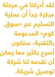 لقد أدركنا في مرحلة مبكرة جداً أن عملية التسليم عبر "سوق.كوم" المدعومة بالتقنية، ستكون أسرع بكثير مما يمكن أن تقدمه لنا شركة توصيل شريكة. في الواقع، كانت تلك بحد ذاتها فرصة، إذ يمكن لنا تقديم خدمة التوصيل تلك إلى شركات أخرى.
