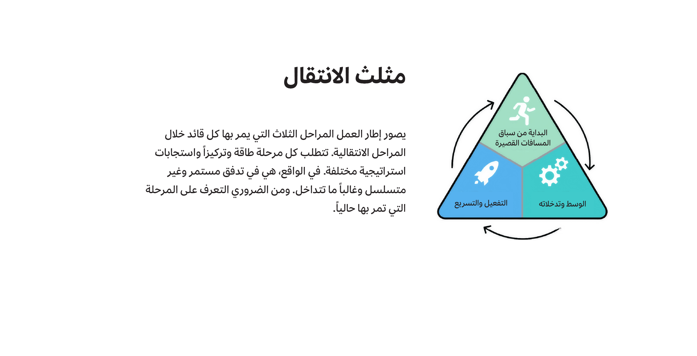 يوفر "مثلث الانتقال" خارطة طريق؛ لكن تذكر أن المراحل لا تسير في تسلسل خطي، وقد تحدث بحسب الظروف. إن إدراكك لها يساعدك على الاستجابة بفعالية في كل مرحلة.