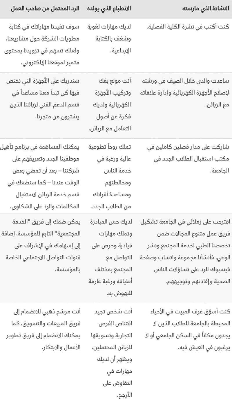 تجاوز نقص الخبرات الحالي واجعل تفكير صاحب العمل ينصب على القيمة التي يمكنك تقديمها لمؤسسته في قادم الأيام. من المعروف أن حديث التخرج لا يملك من الخبرات الشيء الكثير، وأن توظيفه لا يتم أصلاً على أساس ذلك لافتقاده لها وانشغاله في تحصيله العلمي. العنصر الآخر في المعادلة عند حديث التخرج هو ما يمكن أن نطلق عليه "القدرات الكامنة"، وهي تعكس المهمات التي يخمّن صاحب العمل أن بإمكانك إنجازها بكفاءة مقبولة بناء على شيء لاحظه فيك أو أمر فعلته سابقاً. لذا فلا تنفق وقتك في الحديث عن خبراتك المحدودة خلال مقابلة التوظيف ولا تضيع مساحة واسعة من سيرتك الذاتية لتسهب فيها ما لم تكن حقاً تملكها لظرف خاص بك. ركز أكثر على الأنشطة التي قمت بها في كليتك والمشاريع التي ساهمت فيها وما كنت تفعله في أوقات الفراغ سواء بعد الدراسة أو في الصيف، ما يمكن أن يعكس جانباً إيجابياً عنك وعن شخصيتك، كما في الجدول التالي: