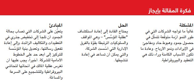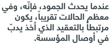 إن معظم الشركات الناجحة ينتهي بها المطاف إلى مواجهة أزمة متوقّعة نسمّيها نحن "الجمود" (stall-out)، وهو عبارة عن تراجع كبير في الإيرادات ونموّ الأرباح، أو انهيار في عوائد المساهمين، التي كانت من قبل مرتفعة، إلى مستوى أقل بكثير من تكلفة رأس المال. وتحصل حالة الجمود هذه عندما يتوقّف محرّك النمو الذي كان يدفع الشركة إلى النجاح عن العمل. ونادراً ما يكون السبب وراء ذلك هو أنّ النموذج التجاري قد أصبح فجأة نموذجاً قد عفا عليه الزمن، فهذا الاعتقاد هو أحد الأخطاء الشائعة. وإنّما تُظهرُ أبحاثنا بأنّ الشركة تكون، في معظم الأحوال تقريباً، قد أصبحت مفرطة في تعقيدها، بسبب البيروقراطية التي تبطئ عملية الاستقلاب في الشركة، أو بسبب خلل وظيفي داخلي يشوّه المعلومات، ويعيق قدرة المدراء على اتخاذ قرارات سريعة والقيام، بناءً عليها، بإجراءات عاجلة. وعندما نتحدّث مع المدراء التنفيذيين عن أعراض الجمود، تتفاوت الكلمات التي يعبّرون بها لكن الأسباب تبقى ذاتها. "لقد فقدنا التواصل مع الزبائن. نحن نغرق في خضم عملياتنا وبرنامج باور بوينت (PowerPoint). لسنا نعاني من نقص في الفرص، لكننّا لم نعد نتصرف بحسم. ورحلتنا التي كانت يوماً ما مفعمة بالطاقة، أصبحت أشبه بمحاولة قيادة طائرة تفتقر إلى قوة الدفع وأجهزة التحكم فيها لا تستجيب".