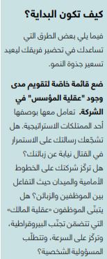 يشتمل العامل الثالث المطلوب للخروج من حالة الجمود على فكرة في مجال الإدارة كانت قد ظهرت إلى حيّز الوجود قبل 40 عاماً، وهي "عقلية المالك" (Owner’s Mindset). وغالباً ما يسيء الناس فهم هذه الفكرة التي كانت قد صُمِّمت لترسيخ الإحساس بالانضباط والمساءلة بخصوص الميزانية، من خلال تحقيق التواؤم بين الموظفين والمساهمين. ففي غالب الأحيان، يتحوّل مضمون هذا المفهوم في نظر الناس ليعكس "عقلية المدير الحالي" القائمة على