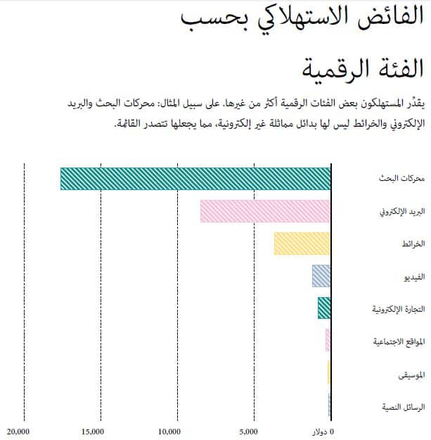 يكون تأثير الفائض الاستهلاكي أكبر بكثير عند النظر بعين الاعتبار إلى فئات السلع الرقمية. وقد أجرينا دراسات لقياسه بالنسبة للفئات الأكثر شيوعاً في الولايات المتحدة (انظر الشكل التوضيحي: "الفائض الاستهلاكي بحسب الفئة الرقمية)، واكتشفنا أن محركات البحث هي الفئة الأعلى قيمة (بمتوسط قيمة يتخطى 17 ألف دولار سنوياً)، متبوعة بالبريد الإلكتروني والخرائط. هذه الفئات ليس لها بدائل مماثلة غير إلكترونية، وكثير من الناس يعتبرونها ضرورية في عملهم وحياتهم اليومية. حين سألنا المشاركين في الدراسة عن التعويض المادي الذي يمكن أن يقبلوا به مقابل التوقف عن استخدام فئة كاملة من السلع الرقمية، وجدنا أن المبلغ كان أكبر من مجموع قيمة التطبيقات الفردية في تلك الفئة. وهذا منطقي، بما أن السلع الموجودة ضمن فئة ما غالباً ما تكون بديلاً لبعضها البعض.