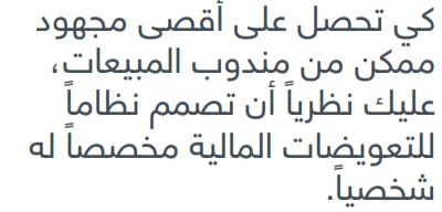 بعض نصائحي ستكون مباشرة: سأشجع المديرين على التخلص من سقف العمولات، أو إذا تحتم عليهم الاحتفاظ بسقف ما لأسباب سياسية، سأنصحهم بتعليته قدر الإمكان. والأبحاث جلية بشأن هذه المسألة؛ تزداد مبيعات الشركات عندما تزيل الحدود التي تتقلص عندها الحوافز الهامشية لمندوبي المبيعات. ربما وقعت مشكلات ما إذا تجاوزت إيرادات بعض مندوبي المبيعات على نحو مهول تعويضات مديريهم أو حتى نافست تعويضات مديريهم التنفيذيين، لكن الدليل القائم يثبت أن الشركات تستفيد عند رفع هذه القيود الاعتباطية.