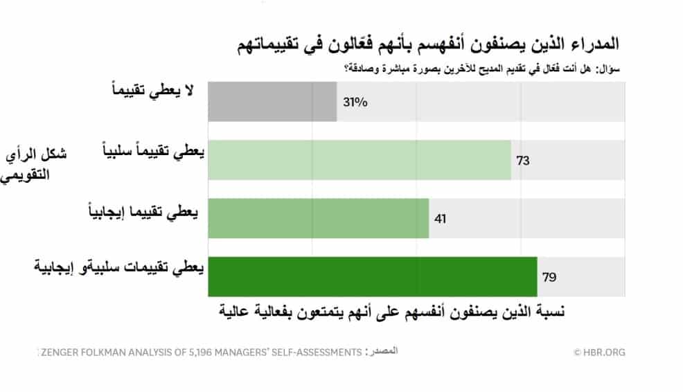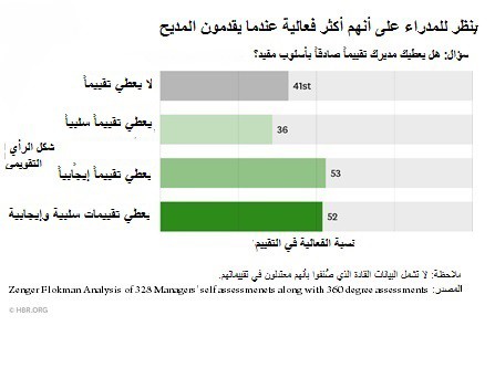 وعند مقارنة التقييمات الذاتية لـ 328 من المدراء، مع نتائج استبيانات شاملة للآراء (استبيانات 360 درجة) تم خلالها تصنيف كل قائد من قِبل 13 مشاركاً على الأقل على أساس مجموعة متنوعة من السلوكيات بما فيها "منح تقييم صريح بأسلوب مفيد". وجدنا أنه يتأثر تصنيف القائد عندما يمنح الآخرين تقييمات فعالة بمدى استعداده لتقديم دعم إيجابي وانفتاحه على ذلك، أما التقييمات السلبية التي كانت تصدر عن المدير، فلم تؤثر في تصنيف المرؤوسين له إلا في حال كان القائد يتجنب منح رأي تقييمي إيجابي لمرؤوسيه. والنتيجة نفسها ظهرت عند النظر إلى تقييمات المرؤوسين المباشرين فقط دون مقارنتها بالتقييمات الذاتية للمدراء.