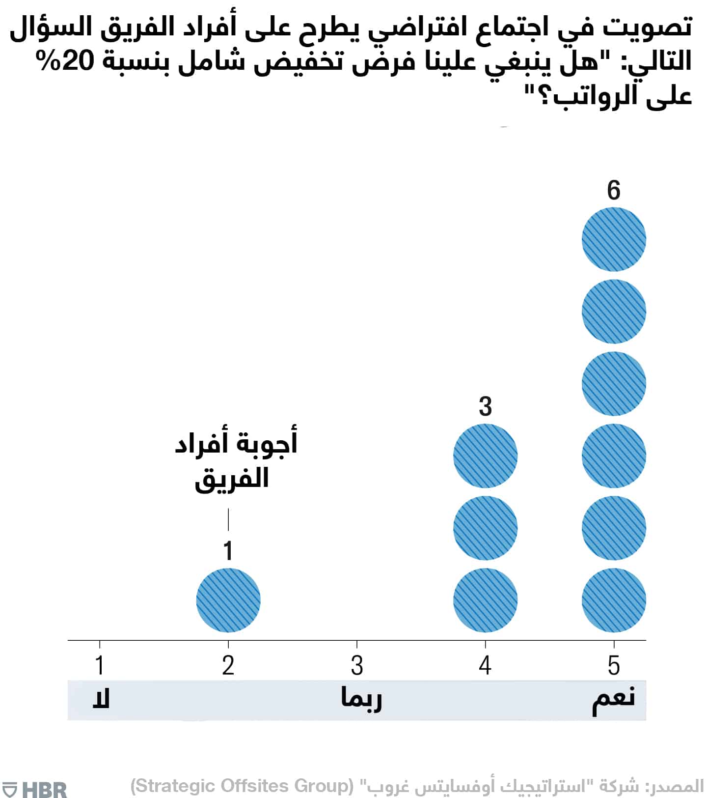 هناك حل أفضل متاح في الاجتماعات الافتراضية عبر الإنترنت، ماذا لو أجرت سماح تصويتاً من نوع آخر بعد أن سمعت مخاوف كوثر؟ يمكنها أن تطرح سؤالاً سريعاً مثل: على مقياس من 1 إلى 5 (1= لا، 3= ربما، 5= نعم)، هل ينبغي علينا فرض تخفيض شامل على الرواتب بنسبة 20%؟