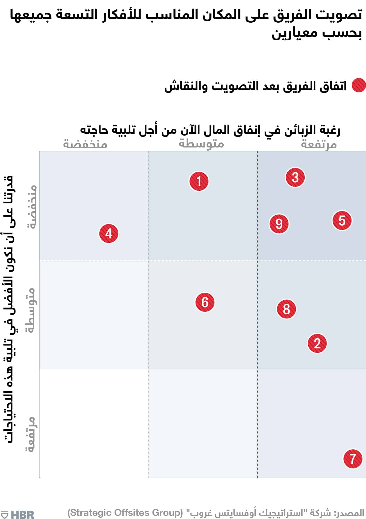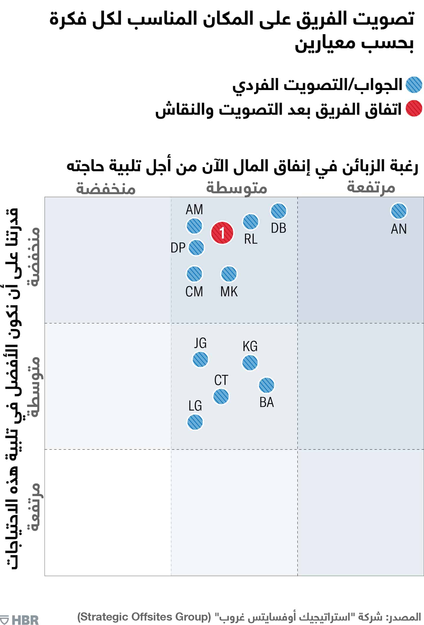 ثم قرأ عمرو الفكرة الثانية وسأل الفريق: "بالنسبة للفكرة الأولى، أين يجب وضع هذه الفكرة؟" أدلى أفراد الفريق بأصواتهم مجدداً، وكرروا هذه العملية سبع مرات، وأمضوا ما بين 5 إلى 10 دقائق على كل فكرة. وعندما اختلف أفراد الفريق في آرائهم، كان عمرو يطلب منهم مناقشة تفضيلاتهم معاً قبل الاتفاق على الموقع المناسب. وكانت النتيجة الجدول التالي: