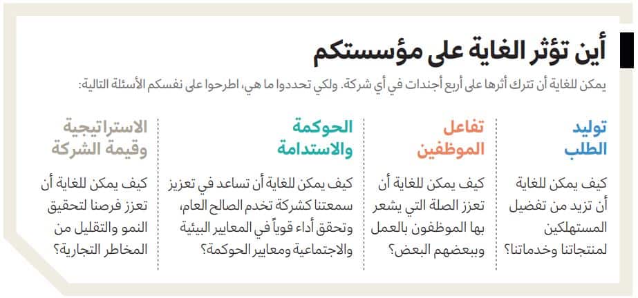 لن تكون هناك استفادة كاملة من القدرات الكامنة للغاية إلا عندما تكون متوافقة مع القيمة المقترحة من الشركة، وتُسْهِم في خلق طموحات مشتركة على المستويين الداخلي والخارجي. ففي أحسن حالاتها، هي الآلية الأقوى لضمان الحصول على الدعم من جميع أصحاب المصلحة. أما إذا طُبّقت بأسلوب سيء أو قائم على التلاعب، فإنها ستعطي نتيجة معاكسة. وبالتالي وفي ظل جميع المخاطر القائمة، يجب أن يكون تحديدكم للغاية الصحيحة التي تناسب شركتكم واحداً من أكثر القرارات إلحاحاً التي يتعيّن عليكم اتخاذها.