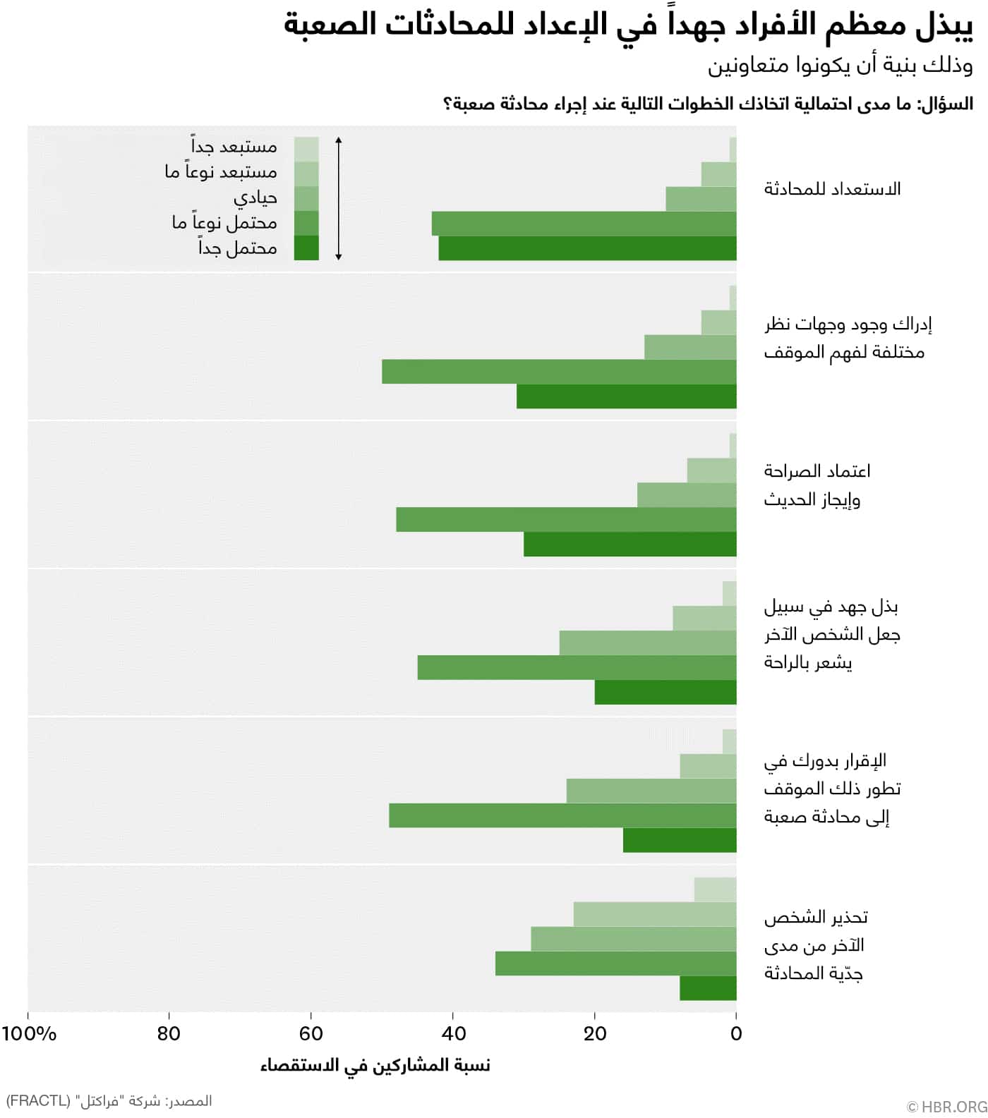 يعد التعامل مع محادثات العمل الصعبة بعقلية عدائية، حيث يفوز شخص ويخسر آخر، خطأ شائعاً عادة ما ينتج عنه شعور كلا الطرفين بعدم الرضا. ولكن دراستنا تظهر أن أغلب الأشخاص يخططون للتعامل بسلاسة وتفهم أثناء استعدادهم لمحادثة صعبة، إذ أخبرنا 66% من المبحوثين أنهم يتكبدون العناء كي يُشعروا الطرف الآخر بالراحة. واعترف العدد نفسه من الأشخاص بمساهمتهم في خلق حالة من عدم الراحة، ويقر 81% منهم أن المسألة تحمل عدة وجهات نظر. وقال أكثر من 75% من المبحوثين أنهم يفضلون الأسلوب المباشر والواضح. وهذه أنباء سارة بالنسبة لشخص يستعد لإجراء محادثة صعبة؛ كن على يقين أن الناس ينوون التعامل بعقلية تعاونية.