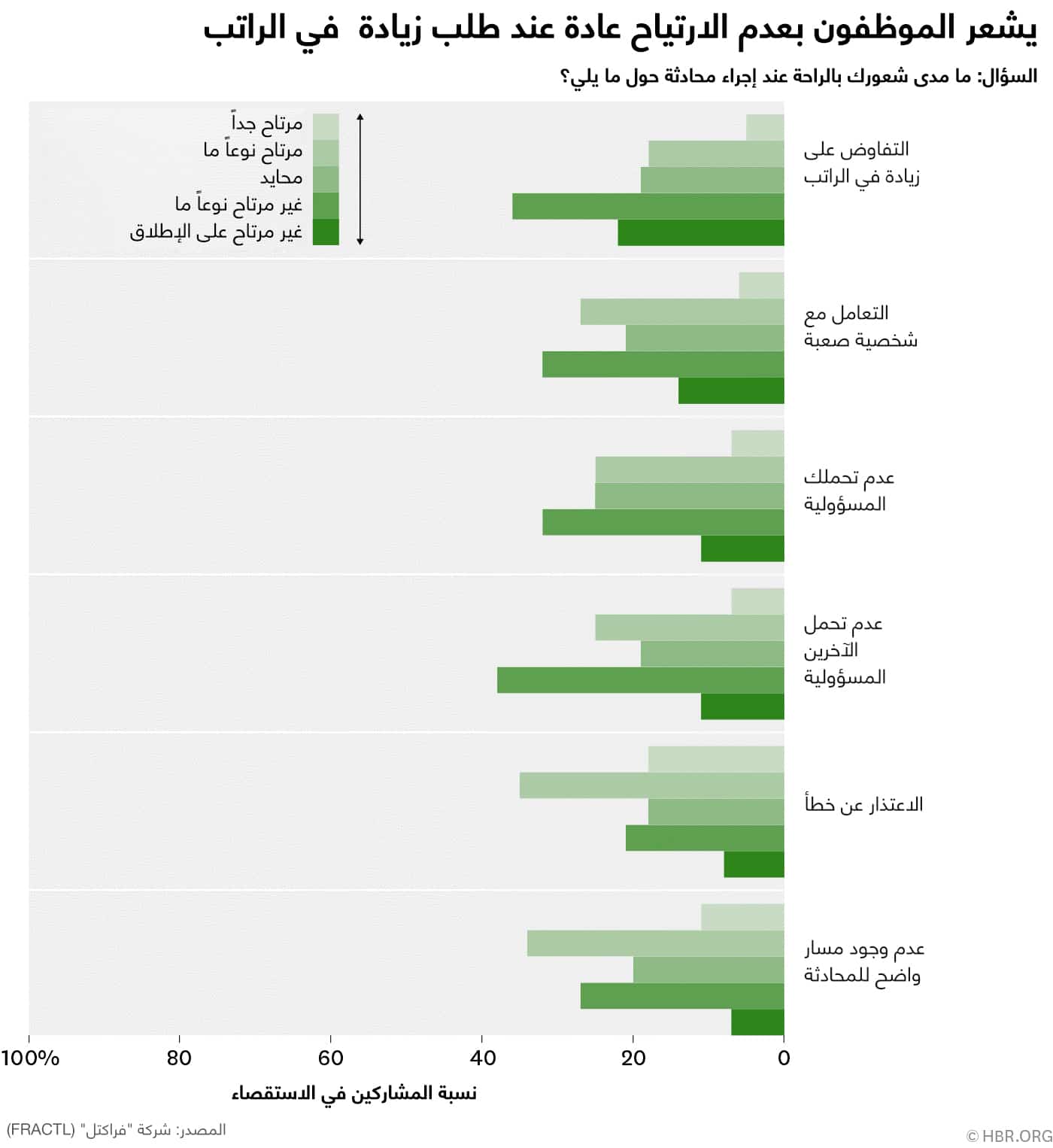 وفضلاً عن ذلك، من المحتمل أن نظيرك يشعر بالتوتر مثلك تماماً. ما هي المحادثات التي تشعر الناس بالتشنج فعلاً؟ المفاوضات بشأن زيادة الراتب من أكثر المحادثات إزعاجاً: حيث يشعر 58% من المبحوثين بعدم الراحة أثناء هذه المناقشة. كما وجدنا أن أكثر حالة يشعر فيها الناس بالراحة هي عند الاعتذار عن خطأ ما أو مناقشة عدم وجود توجيهات واضحة.
