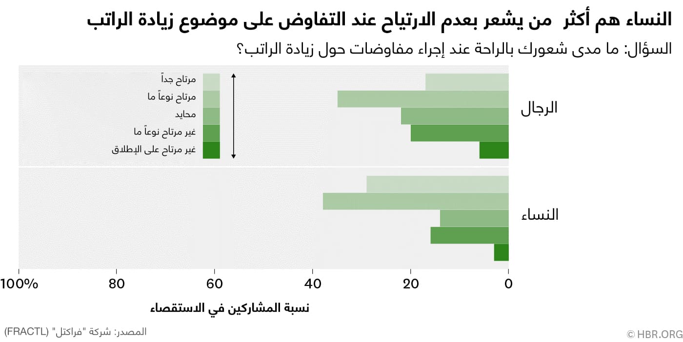 وقد أشارت النساء إلى شعورهن بعدم الراحة أثناء التفاوض بشأن زيادة الراتب أكثر من الرجال، حيث شعرت أكثر من 66% من المبحوثات بمستوى عال أو متوسط من عدم الراحة. وقد كان هذا شعوراً مشتركاً بين أكثر من نصف الرجال المشاركين.