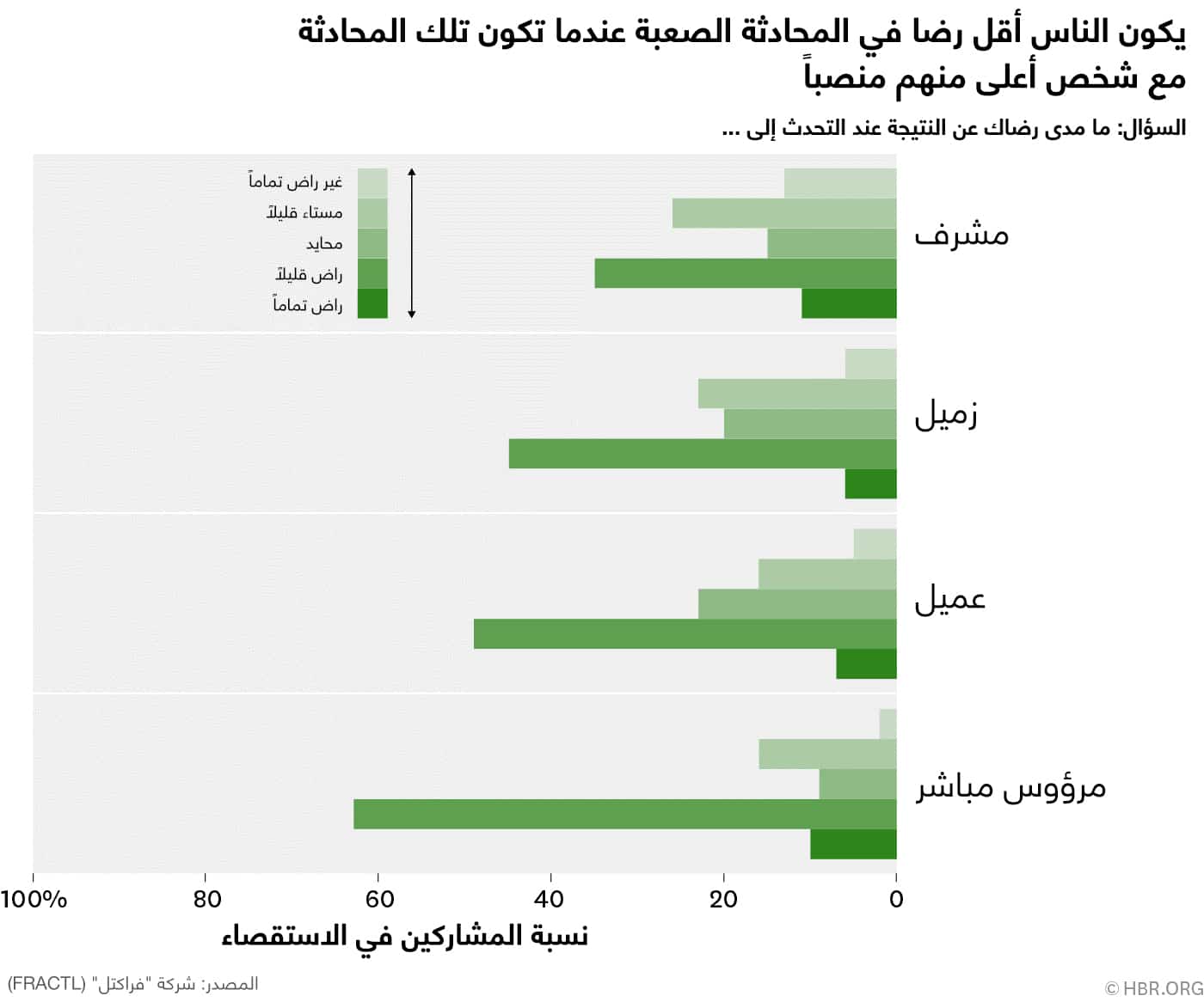 ينبغي على المدراء الانتباه جيداً إلى البيانات التي تشير إلى أنهم وإن شعروا بالراحة تجاه نتائج مناقشة ما، فهذا لا يعني أن الموظفين يشاركونهم النظرة ذاتها. فقد كان احتمال شعور المبحوثين بالرضا عن نتيجة محادثة صعبة أعلى بكثير عندما كانوا الموظفين الأعلى رتبة. وشعر أكثر من 75% منهم بالرضا عن نتيجة المحادثة مع مرؤوس مباشر، مقارنة بنسبة 46% من المبحوثين الذين شعروا بالرضا بشكل كامل أو جزئي عن نتيجة محادثة مع المشرف عليهم.