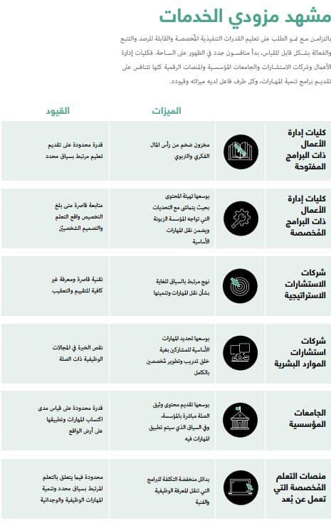في تلك الأثناء، في ظل إلمام متزايد لكبار مسؤولي التعلم بنماذج تطوير المهارات التي يستخدمها مزودو الخدمات، ستتراجع قيمة عروض مزودي خدمات التعلم التقليديين كمؤشر معترف به، لأن برامجهم سيصبح من السهل استنساخها. وهذا الأمر يتجلى بالفعل في عدد "المسابقات" التي يتعين على كليات إدارة الأعمال الرائدة المشاركة فيها للفوز بأعمال مؤسسية. درست إحدى شركات الخدمات المالية العالمية البارزة مؤخراً عروضاً تدريبية من عدد لا يقل عن 10 كليات مرموقة في الجولة الأخيرة من التقييم، مما يعكس المنافسة في السوق التي لم تكن موجودة منذ خمس سنوات ماضية.