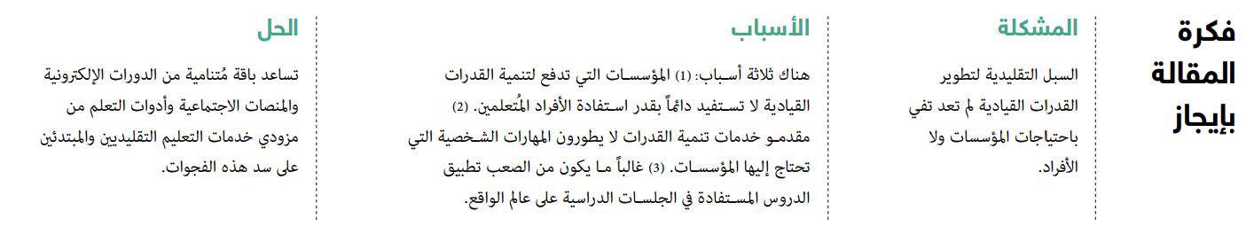 لم تكن الحاجة إلى تطوير القيادة أكثر إلحاحاً من قبل قط. فالشركات على اختلاف ألوانها وأطيافها تدرك أن الصمود في بيئة اليوم المتقلبة والمشوبة بالشكوك والمعقدة والغامضة يقتضي احتياجها إلى مهارات قيادية وقدرات مؤسسية تختلف عن تلك التي ساعدتها على النجاح في الماضي. وهناك إقرار متنامٍ أيضاً بأن تطوير القدرات القيادية لا ينبغي أن يكون قاصراً على القلة الذين يشغلون مناصب الإدارة العليا أو المقربين إليهم. ففي ظل انتشار منصات حل المشاكل التآزرية و"السياسات الارتجالية" الرقمية التي تشدد على المبادرة الفردية، من المتوقع أن يتخذ جميع الموظفين على نحو متزايد قرارات بالغة الأهمية تتسق مع استراتيجية المؤسسة وثقافتها. ولذلك، فمن الأهمية بمكان أن يكونوا مُسلحين بالمهارات الفنية ومهارات العلاقات ومهارات التواصل.