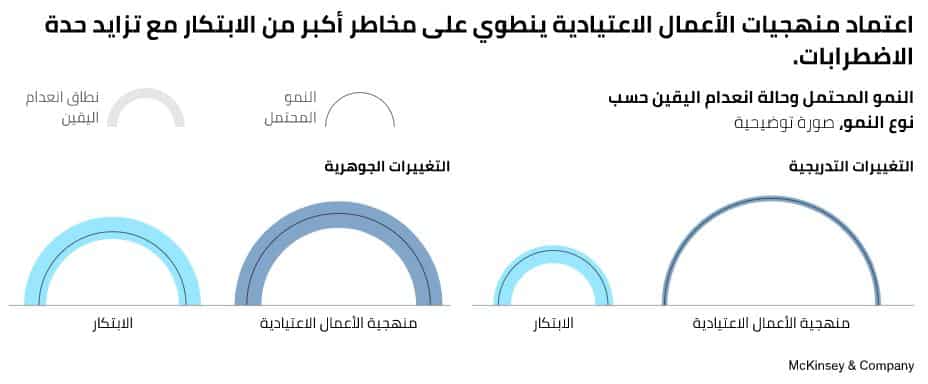 شهدنا في السنوات الأخيرة تغير الافتراضات التي تقوم عليها العديد من مجالات الأعمال ومبادرات النمو أو زوالها بشكل كامل. وتكون الشركات التي تعتمد نماذج عمل مصممة لمواكبة مجموعة محددة من الظروف العالمية أكثر عرضةً للتغيرات، وأكثر حاجةً لزيادة الاستثمار في الابتكار حتى تتمكن من فتح مسارات جديدة تضمن استمراريتها. وبرزت هذه المشكلة في حالات النقص التي طالت قطاعات السلع الاستهلاكية والتجزئة والسيارات، حيث تمتد الاضطرابات إلى قطاعات أخرى كلما توسعت أزمة الطاقة الراهنة. وبالمقابل، تسهم نماذج العمل القادرة على معالجة التحديات القائمة في مساعدة الشركات على الخروج من الاضطرابات، من خلال العودة إلى عمليات الإنتاج المحلية أو التوسع نحو العروض الرقمية. وخلال فترات التحولات الكبرى، تنطوي مواصلة نماذج العمل الاعتيادية على مخاطر أكبر مقارنة بمنهجية الابتكارات الجريئة، حيث يُعد تحويل الموارد نحو الابتكارات الكبيرة والجريئة من وسائل الحماية في مواجهة انعدام اليقين.