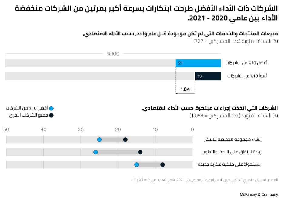 توفر حالة انعدام اليقين فرصة مثالية للشركات من أجل البحث عن مجالات للتنويع والتوسع خارج مجال عملها الرئيسي. وتوجهت العديد من الشركات للاستفادة من فرص الابتكار في الأسواق المجاورة، مثل قيام متاجر البقالة بزيادة خيارات التوصيل، وذلك نتيجةً للصدمات الاقتصادية التي أسفرت عنها جائحة كوفيد-19 وتعطل سلاسل التوريد والاضطرابات الجيوسياسية. كما وجد مزودو خدمات التنقل فرصة جديدة قيّمة في خدمات توصيل الطعام، بينما تعمل بعض شركات تصنيع السيارات الكهربائية على الاستثمار في إنتاج البطاريات وإعادة تدويرها في الوقت الراهن. وكشف أحد أبحاث ماكنزي، الصادر في مايو/آيار 2021، أن أفضل 10% من الشركات من حيث الأداء الاقتصادي حققت ابتكارات أسرع بحوالي مرتين من الشركات ضعيفة الأداء من حيث توفير المنتجات والخدمات الجديدة، وذلك خلال أول 12 شهرًا من الجائحة. (الشكل 3).