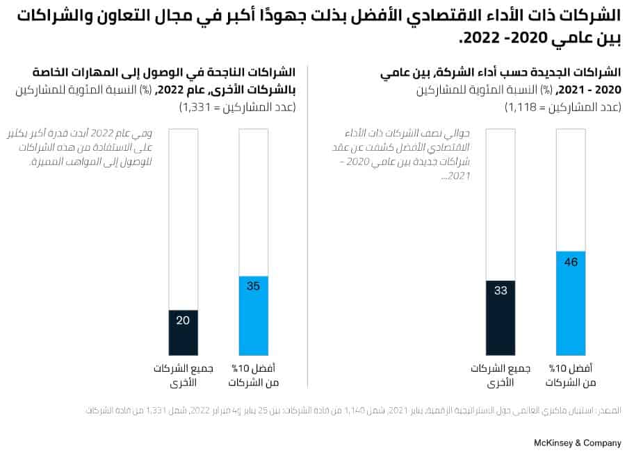نجحت الشركات ذات الأداء الاقتصادي الأفضل خلال السنوات الثلاث الماضية بمضاعفة استثماراتها في الشراكات الجديدة (الشكل 4). وتساعد التحالفات والمشاريع المشتركة الشركات الكبرى على تطوير نماذج عملها أو عروضها بسرعة أكبر بالمقارنة مع عمل الشركات بشكل منفرد.