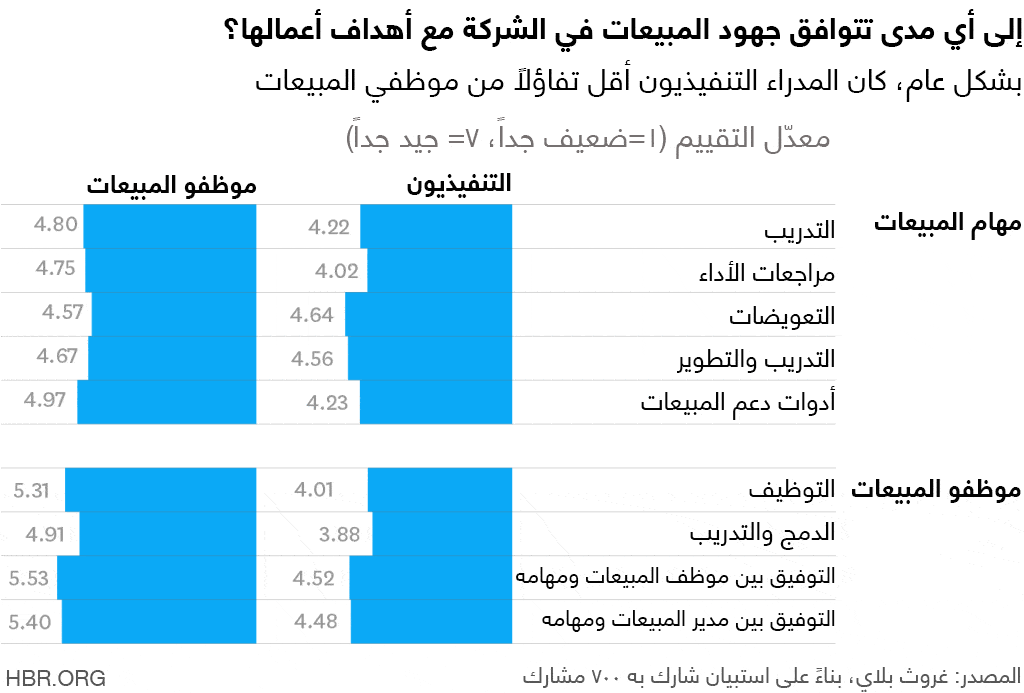 وفقاً لتقييم شارك به أكثر من 700 من المختصّين في مجال المبيعات والمديرين رفيعي المستوى وأجرته شركة GrowthPlay- وهي شركة استشارات متخصّصة في قضايا المبيعات، وأحد كتّاب هذه المقالة هو مديرها الإداري، تبيّن أنّ المشكلة تتعلّق بالتباين الحاصل في زوايا النظر والتوجّهات وتدفق المعلومات بين المديرين التنفيذيين وممثلي المبيعات.