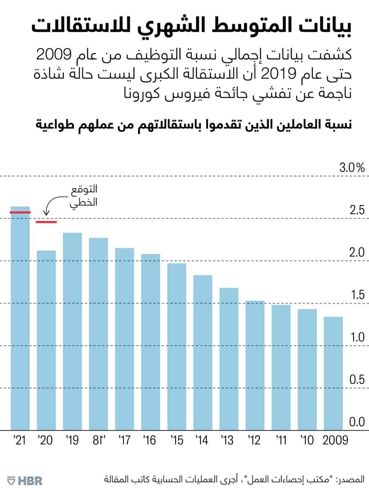 يوحي الشكل والأرقام المرفقة إلى شيء ذي دلالة واضحة. فقد ظل المتوسط الشهري للاستقالات يرتفع بمقدار 0.10 نقطة مئوية كل عام، خلال الفترة من عام 2009 إلى عام 2019. ثم تباطأ معدل الاستقالات عام 2020، في ظل إقدام العاملين على الاحتفاظ بوظائفهم بأعداد أكبر، بسبب حالة عدم اليقين التي أحدثتها جائحة "كوفيد-19". استمر هذا التباطؤ لفترة قصيرة. فعندما تم إقرار المعونات المالية وتراجعت حالة عدم اليقين بعض الشيء عام 2021، أقبل عدد قياسي من العاملين على الاستقالة من عملهم، ما أدى إلى نشوء الظاهرة المعروفة باسم "الاستقالة الكبرى". لكن هذا العدد شمل الكثير من العاملين الذين كان من الممكن أن يستقيلوا في عام 2020 لولا وقوع الجائحة. لقد عدنا الآن إلى التوافق مع الاتجاه السائد في حقبة ما قبل تفشي الجائحة، وهو اتجاه يبدو أن أصحاب العمل الأميركيين سيواجهونه طوال السنوات المقبلة.