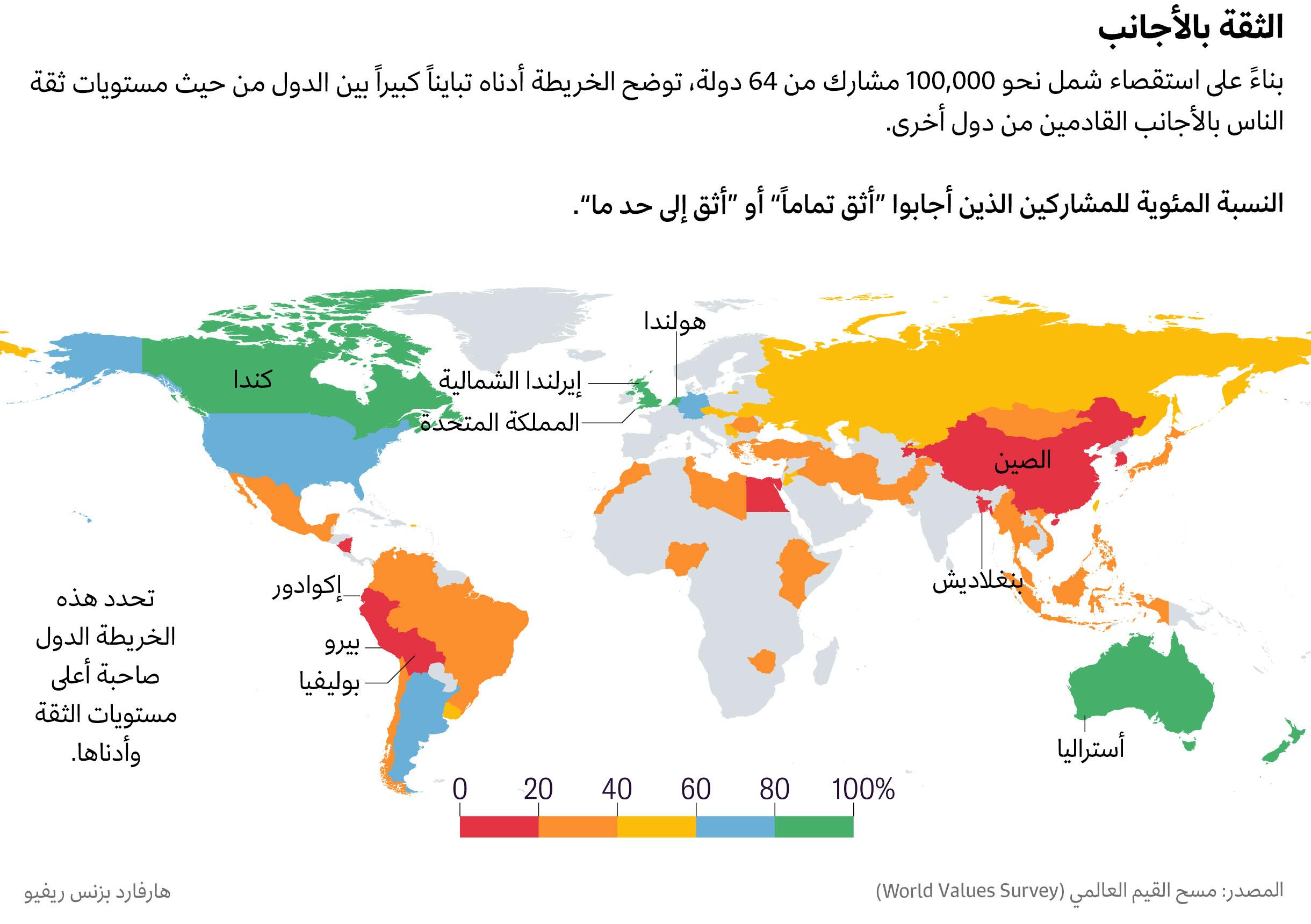 يختلف مستوى الثقة بالشركاء الأجانب إلى حد كبير من ثقافة إلى أخرى، فهي مرتفعة نسبياً في الولايات المتحدة على سبيل المثال؛ في استقصاء عالمي حديث سأل المشرفون عليه الأشخاص عن مدى ثقتهم بأشخاص من دول أجنبية أخرى، أشار 75% من الأميركيين إلى أنهم يثقون "إلى حد ما" أو "تماماً" بالأجانب، في المقابل كانت النسبة 17% فقط بين الصينيين. تُظهر الخريطة أدناه أن مستوى الثقة بالدول الأجنبية يميل إلى الارتفاع أكثر في الدول الغربية المتقدمة مقارنة بمناطق العالم الأخرى. في البلدان التي تكون فيها الثقة بالدول الأجنبية منخفضة، يكون إشراك الشركاء المحليين هو المفتاح لتأسيس موطئ قدم للشركة.