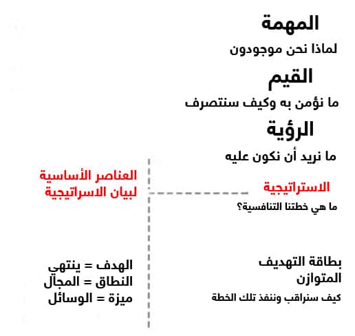 في البداية دعونا نوضح بيان المهمة الذي يُخلط بينه والهدف الاستراتيجي، وهو ببساطة يوضح بدوره السبب الأساسي لانخراطك في هذا المجال تحديداً في المقام الأول؛ بمعنى آخر، المساهمة التي تطمح الشركة إلى تقديمها في المجتمع؛ فعلى سبيل المثال، قد تقوم شركة تأمين مثلاً بتعريف مهمتها على أنها توفير الأمن المالي لعملائها. إلا أنه لا يمكن أخذ بيانات المهمة تلك كأهداف استراتيجية لتوجيه القرارات التجارية الخاصة بالحاضر. وبالمثل، من الجيد والمناسب أن تكون الشركات واضحة مع موظفيها بشأن القيم الأخلاقية، لكن مبادئ على غرار احترام الفروق الفردية والحفاظ على البيئة ليست ببيان استراتيجية أيضاً، بل هي لائحة فقط تنظم سلوك الموظفين، (أي القيام بالأمور بالشكل الصحيح)؛ وهي لا ترشدهم إلى ما على الشركة القيام به (أي الشيء الصحيح الواجب القيام به).
