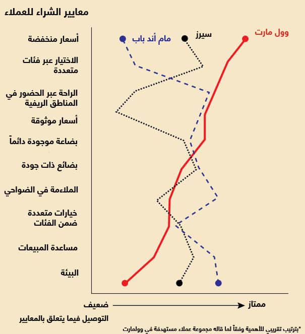 يمكن تلخيص عرض القيمة المقدم من وول-مارت على أنه "أسعار منخفضة كل يوم، لنطاق واسع من السلع، كائنة دائماً في مواقع جغرافية ملائمة". إنها تلك المظاهر من تجربة المستخدم التي تقدمها الشركة مقارنةً بالمنافسين.