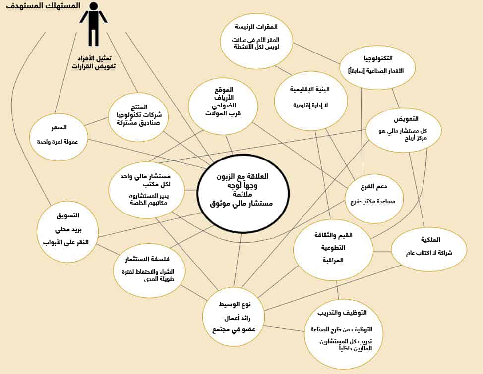 وبالنظر إلى شكل "خريطة نظام-نشاط إدوارد جونز"، ستجد أن عرض القيمة الخاص بهذه الشركة هو تقديم خدمات مشورة مريحة وموثوقة وشخصية الطابع. وما يميز الشركة وجود مستشار مالي واحد فقط في كل مكتب من مكاتبها، الأمر الذي يتيح لها نشر مكاتب أكثر على امتداد البلاد مقارنةً بالمنافسين ليصل عدد تلك المكاتب في الولايات المتحدة إلى 10 آلاف مكتب. وفي المقابل نجد أن منافستها شركة ميرل لينش، لديها حوالي 15 ألف وسيط، إنما مع 1000 مكتب فقط. وتضع شركة جونز مكاتبها في مراكز التسوق ومناطق البيع بالتجزئة في المناطق الريفية والضواحي بدلاً من المباني الشاهقة في وسط المدينة أو المربعات التجارية في المدن الكبرى بغرض تسهيل زيارة عملائها الذين تستهدفهم، في أوقات تناسبهم، ولرغبتها في توفير بيئة مريحة وأنيقة ومُرحِّبة. وتتطلب هذه الاختيارات وحدها أن يختلف تكوين شركة جونز اختلافاً جذرياً عن شركات الوساطة الأخرى، إذ أنه ومع عدم وجود إدارة إقليمية أو مكتب فرعي يوفر التوجيه أو الدعم، على كل مستشار مالي أن يتصرف كرائد أعمال يدير أعماله بكل سعادة وحماس. ونظراً لأن هؤلاء الأشخاص يمثلون استثناءً في الصناعة، يتعين على "جونز" توظيف مستشاريها الماليين من صناعات أو خلفيات مختلفة غير مالية، وإنفاق مبالغ كبيرة على تدريبهم. فحتى عام 2007، وعندما تحولت الشركة إلى خدمة قائمة على الإنترنت، كانت تستخدم شبكة أقمار صناعية خاصة بها، لتزويد المكاتب المنتشرة على امتداد البلاد بعروض الأسعار في الوقت الفعلي، والسماح لتلك المكاتب بإنجاز الصفقات. ونظراً لوجود 10 آلاف مكتب منفصل لدى الشركة، زادت تكاليفها فيما يتعلق بالعقارات والاتصالات بنحو 50% عن مثيلاتها في الصناعة. ومع ذلك، تسمح جميع هذه المكاتب للمستشارين الماليين الذين يديرونها بتقديم خدمات ومشورة مريحة وموثوقة وشخصية الطابع.