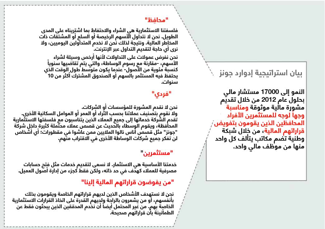 في الواقع، عدد قليل جداً من المسؤولين التنفيذيين استطاعوا الإجابة بصراحة عن هذه الأسئلة البسيطة، وغالباً ما كانت الشركات التي عمل فيها هؤلاء التنفيذيون هي الأكثر نجاحاً بين أقرانها في الصناعة. وإحدى هذه الشركات كانت شركة إدوارد جونز، وهي شركة وساطة مقرها مدينة سانت لويس الأميركية، والتي نتعامل معها منذ أكثر من 10 سنوات. واستطاعت "جونز"، وهي رابع أكبر شركة وساطة في الولايات المتحدة، مضاعفة حصتها أربع مرات على مدار العقدين الأخيرين، كما تفوقت باستمرار على منافسيها من حيث العائد على الاستثمار سواء في الأسواق النامية، أو حتى الأسواق الضعيفة، فضلاً عن وجودها المستمر ضمن قائمة فورتشن للشركات الكبرى ذات بيئة العمل المميزة. وكان رهاناً آمناً أن يستطيع أي موظف من موظفي الشركة، والبالغ عددهم 37 ألفاً، طرح استراتيجية الشركة بشكل موجز، وهي أن "شركة جونز كانت تهدف إلى نمو عدد مستشاريها الماليين من 10 ألاف مستشار في عام 2008، إلى 17 ألف مستشار بحلول عام 2012، عبر تقديم مشورة مالية موثوقة ومريحة وشخصية للمستثمرين الأفراد المحافظين، والذين يفوضون قراراتهم المالية إلى أولئك المستشارين، من خلال شبكة من المكاتب على مستوى البلاد، كل مكتب منها يضم مستشار مالي واحد فحسب".